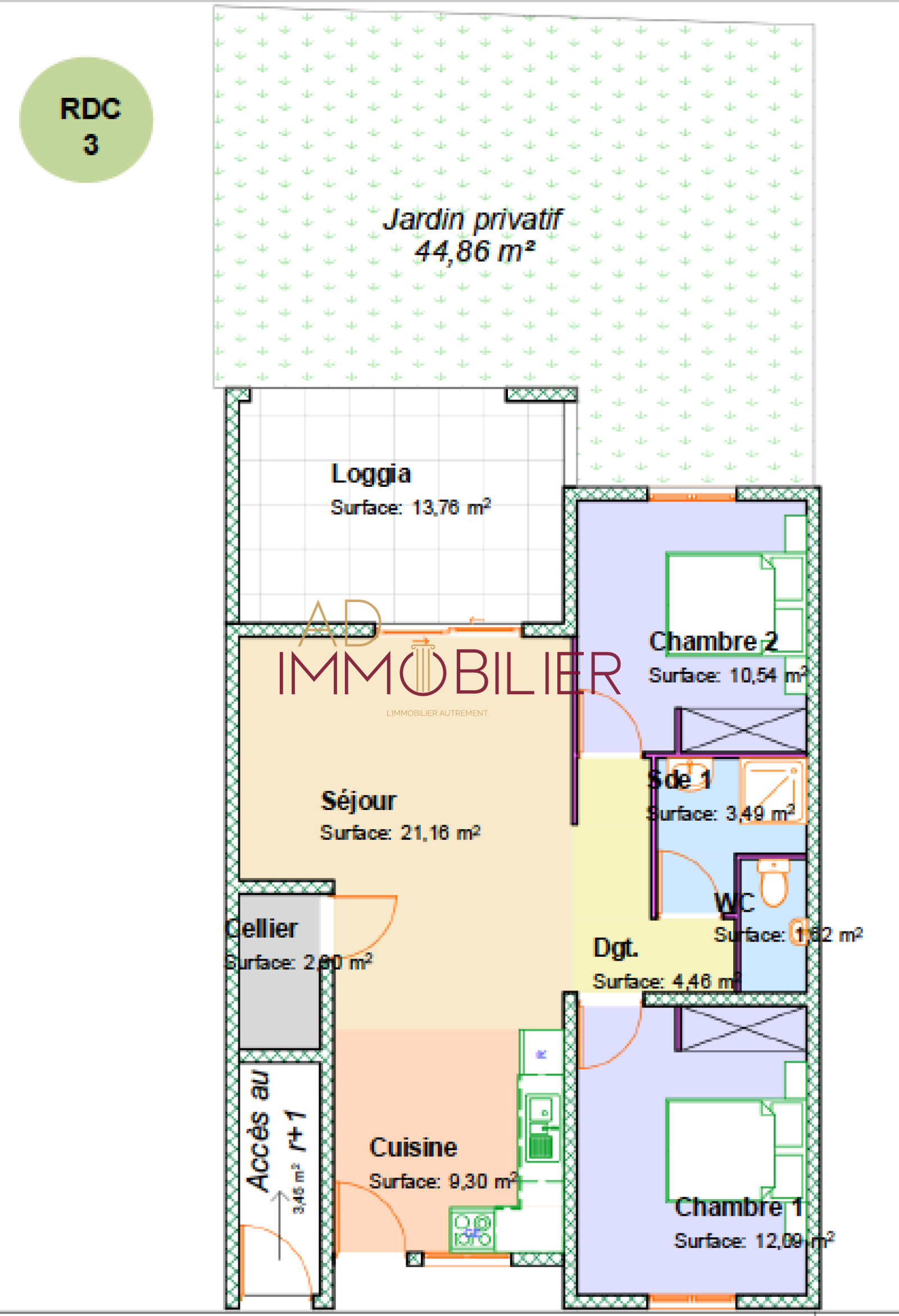 Ampartement T3 de 64.96m² habitables avec terrase de 13.76m² et jardin privatif de 44.86m², situé au RDC du Bât A.
