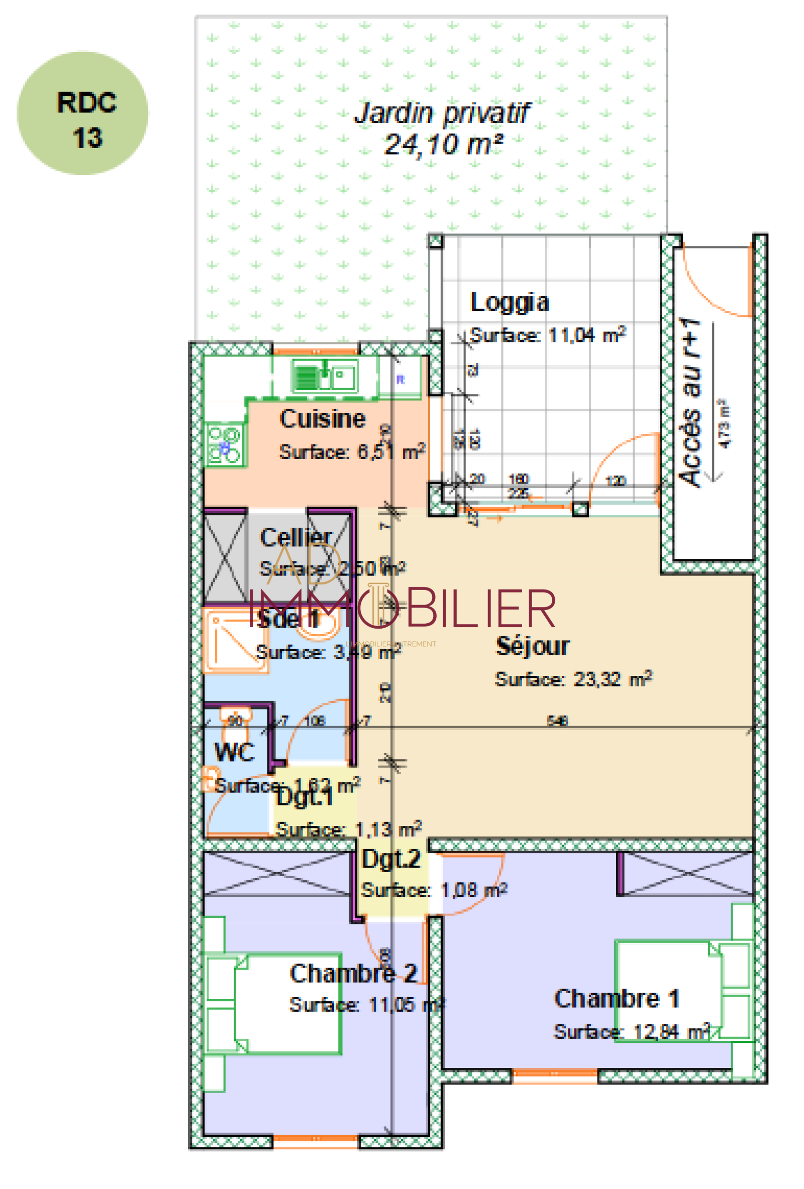 Appartement T3 de 63.54m² habitables avec terrasse de 11.04m² et jardin privatif de 24.10m², situé au RDC de Bât B