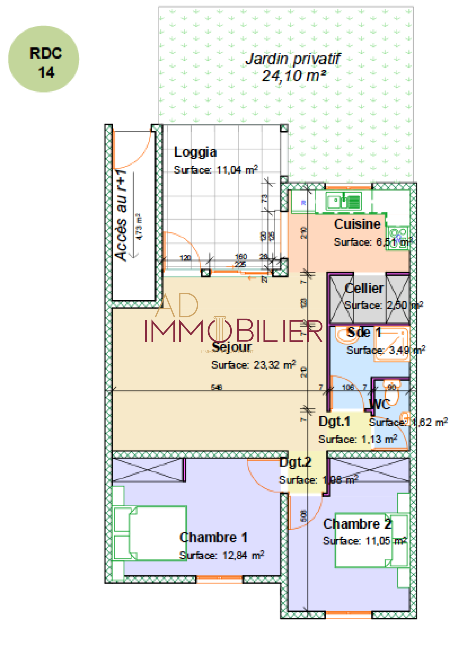 Appartement T3 de 63.54m² habitables avec terrasse de 11.04m² et jardin privatif de 24.10m², situé au RDC du Bât B.