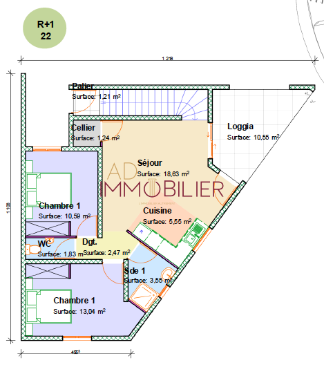 Appartement T3 de 56.90m² habitables avec terrasse de 10.55m², situé au 1er étage du Bât B.